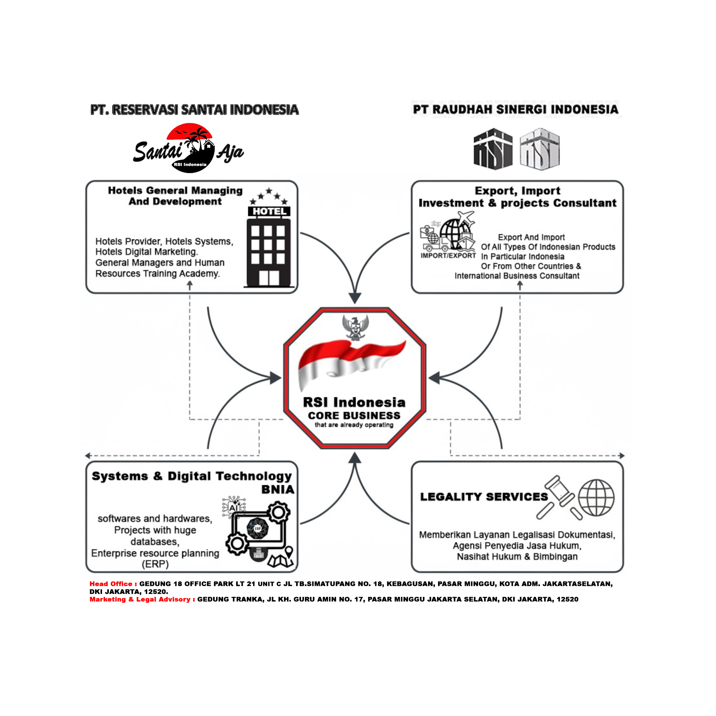 - The time has come for BNIA to merge with RSI Indonesia again in Indonesia under the name of the two companies RSI Indonesia (PT RAUDHAH SINERGI INDONESIA & PT RESERVASI SANTAI INDONESIA) with projects concerned with the complete general management of hotels, their development, marketing and room reservations covering the entire country of Indonesia, including this through digital technology ERP and RCM using unified databases and in addition to the General Managers Training Academy, Training and development of Human Resources.